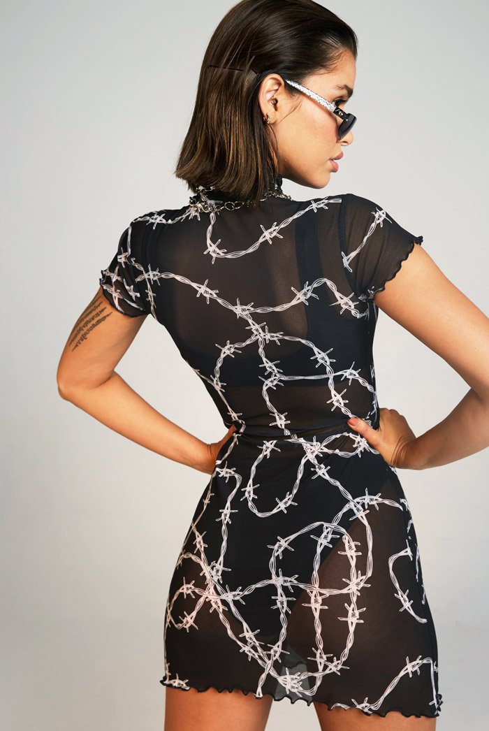 %text-1-start% Upgrade your beach wardrobe this season rocking our barbed wire print sheer mini dress!