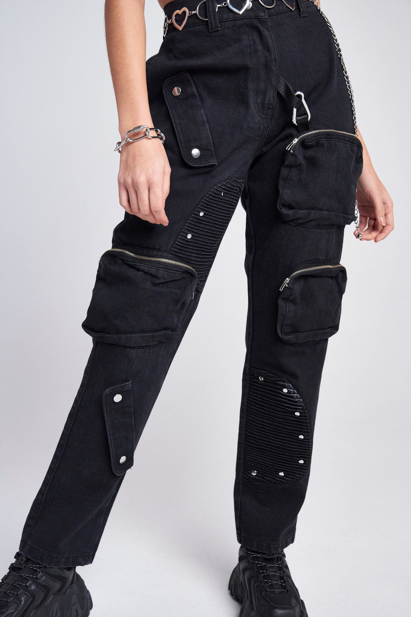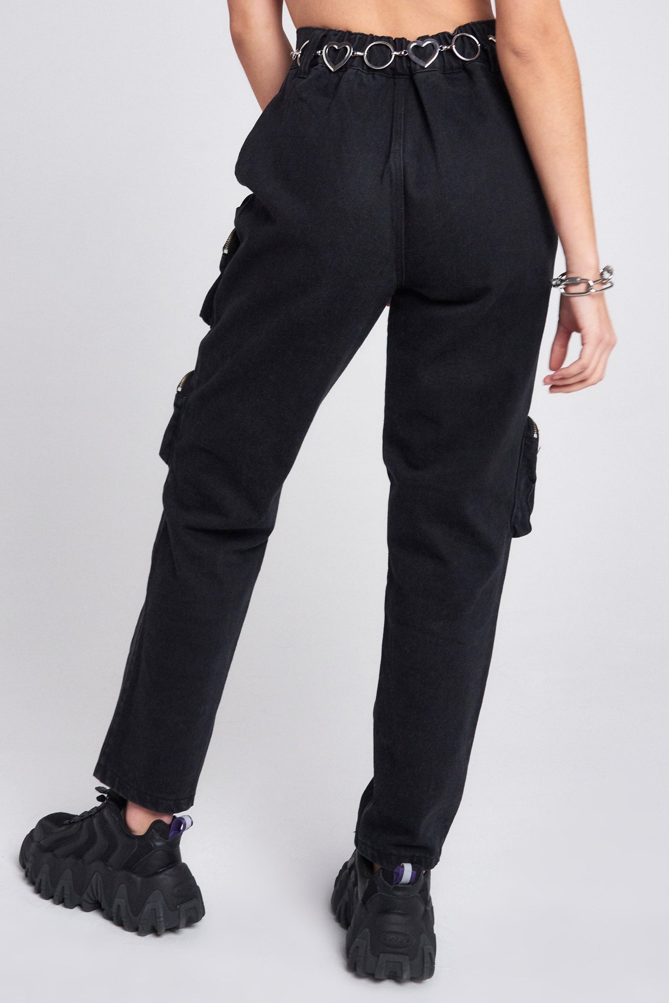%text-1-start% Kick back in style this season rocking our black cargo jeans with round pocket detail!