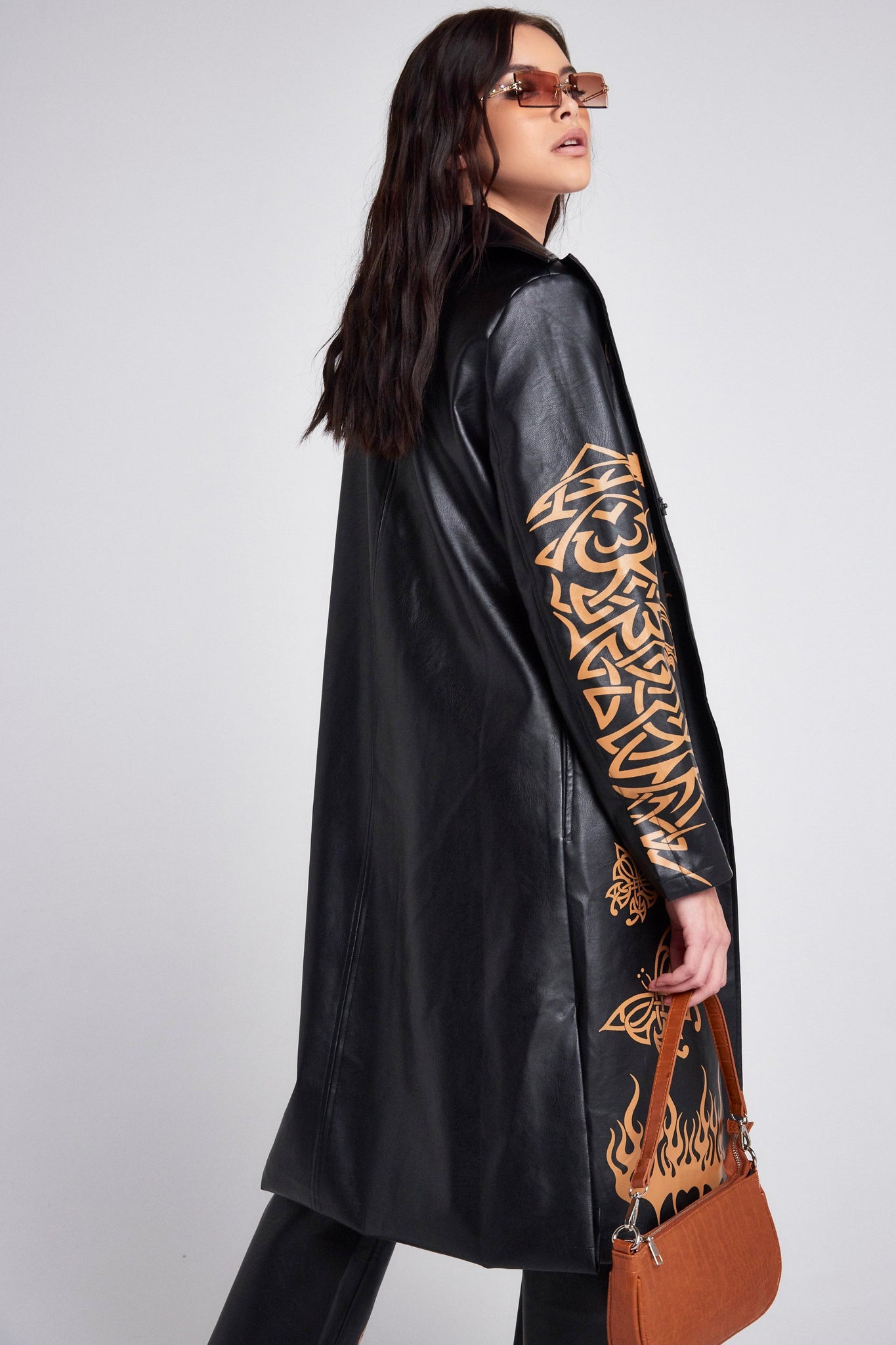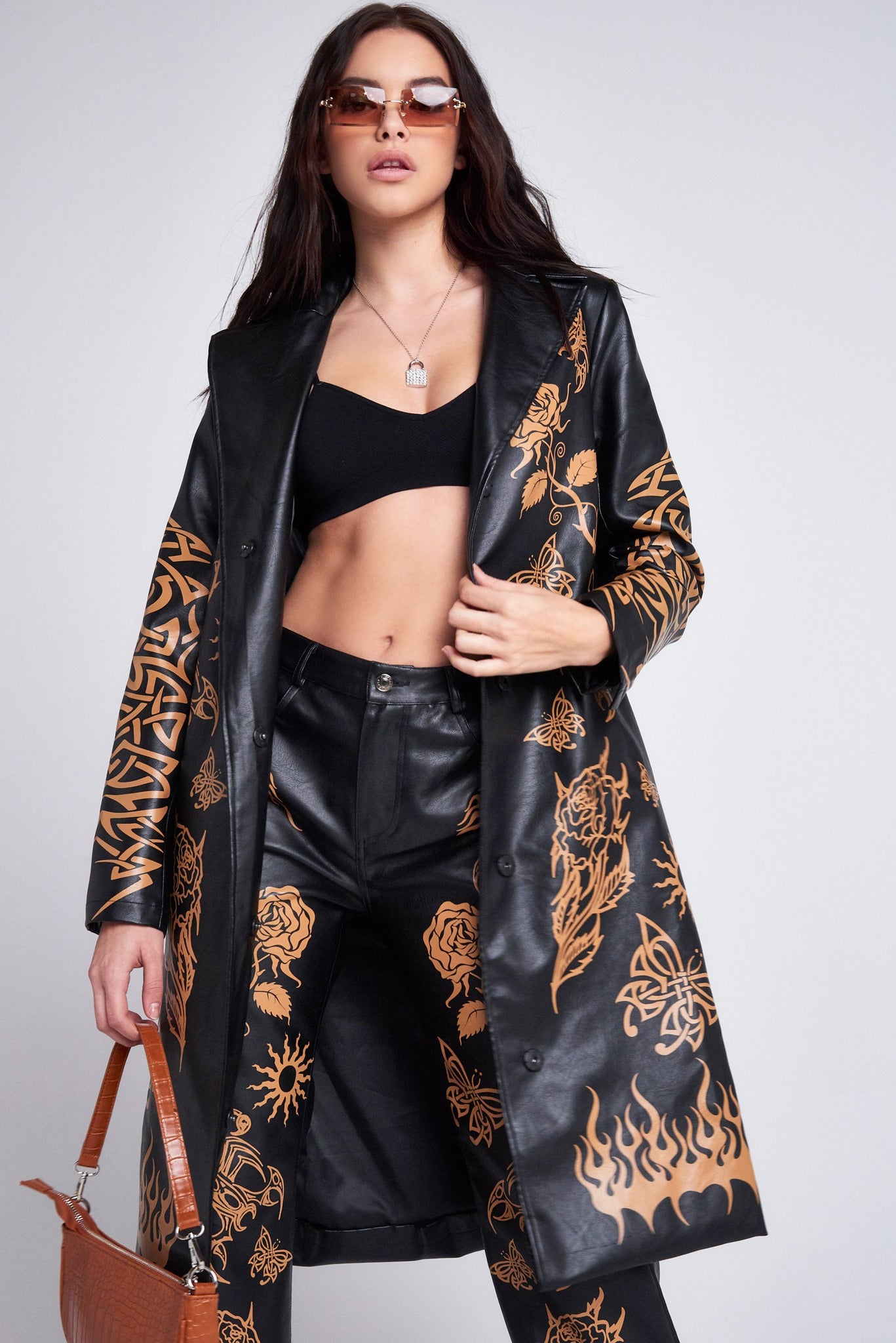 %text-1-start% Upgrade your wardrobe this season rocking our black vegan leather jacket with tan tattoo detail! Pair with the matching trousers for the ultimate co-ord!