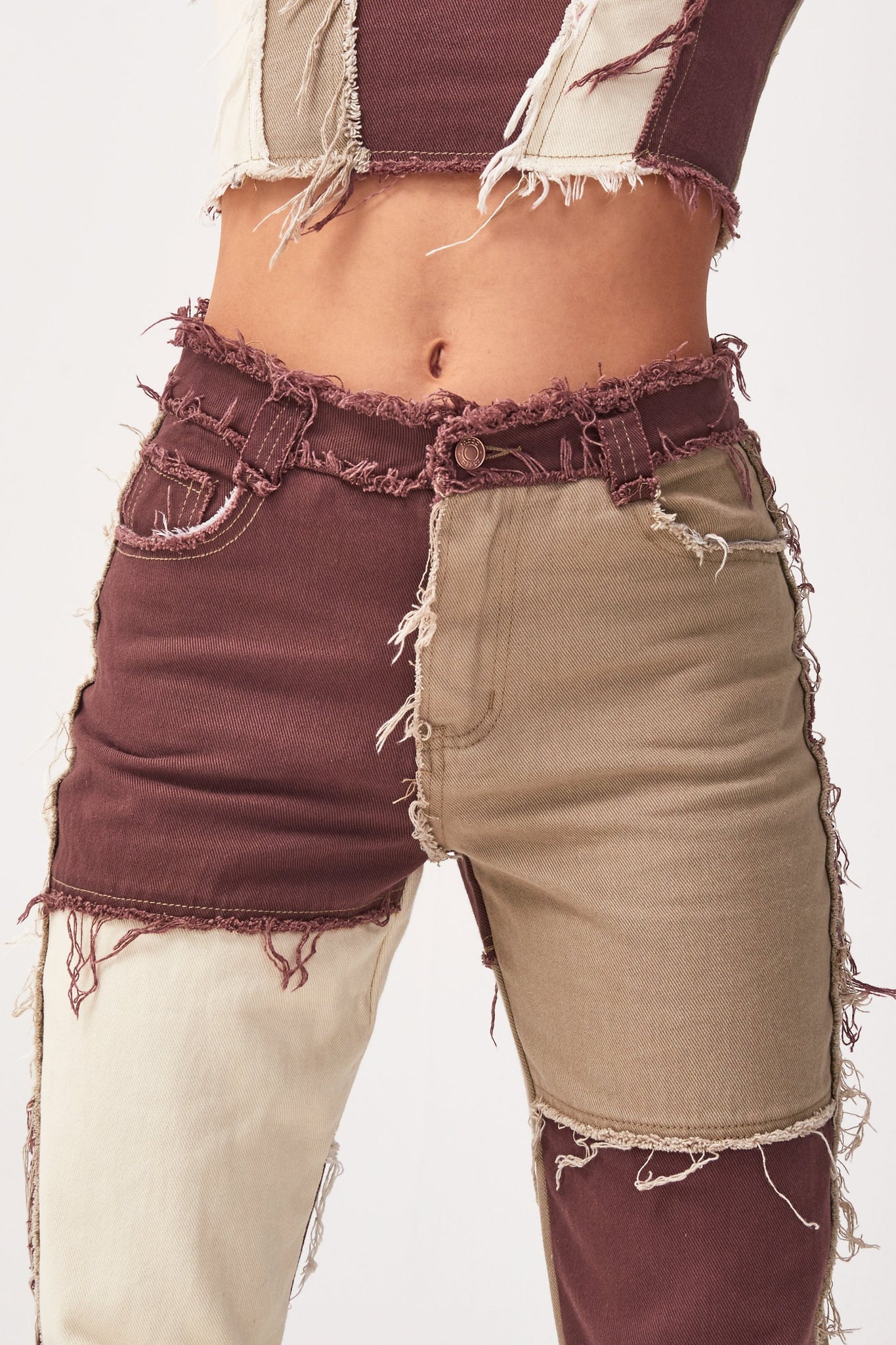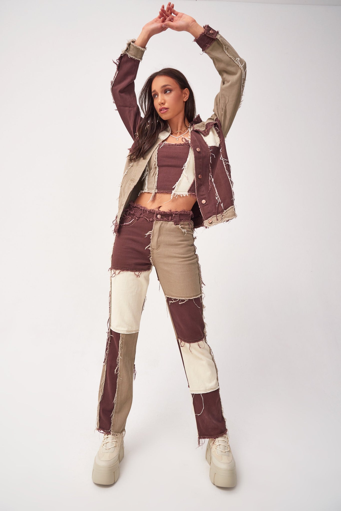 %text-1-start% Throw it back this season rocking our super cute brown patchwork boyfriend jeans, pair with the matching jacket & top for ultimate outfit goals!