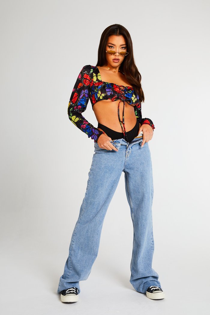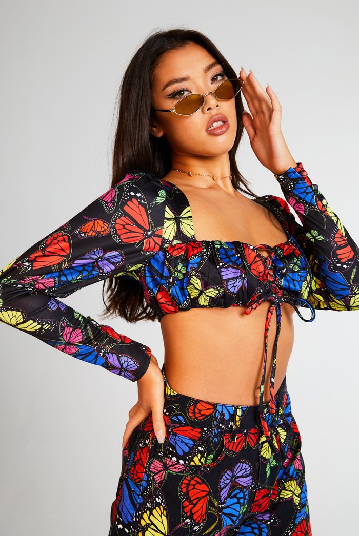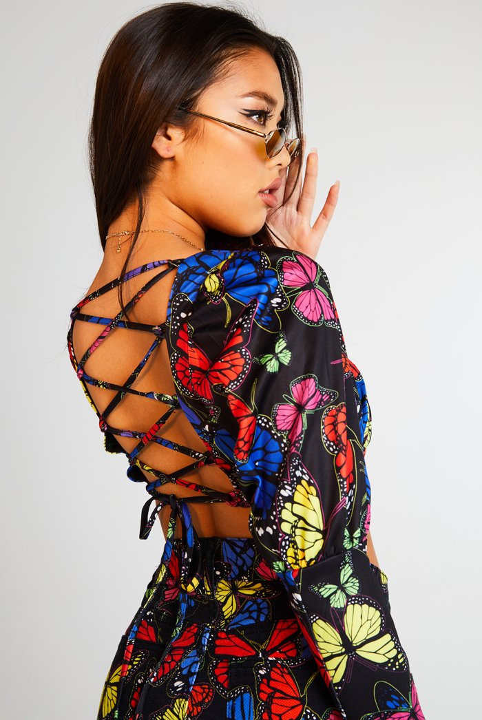 %text-1-start%Butterfly baby! Spread your wings this summer rocking our super cute black butterfly print crop top!