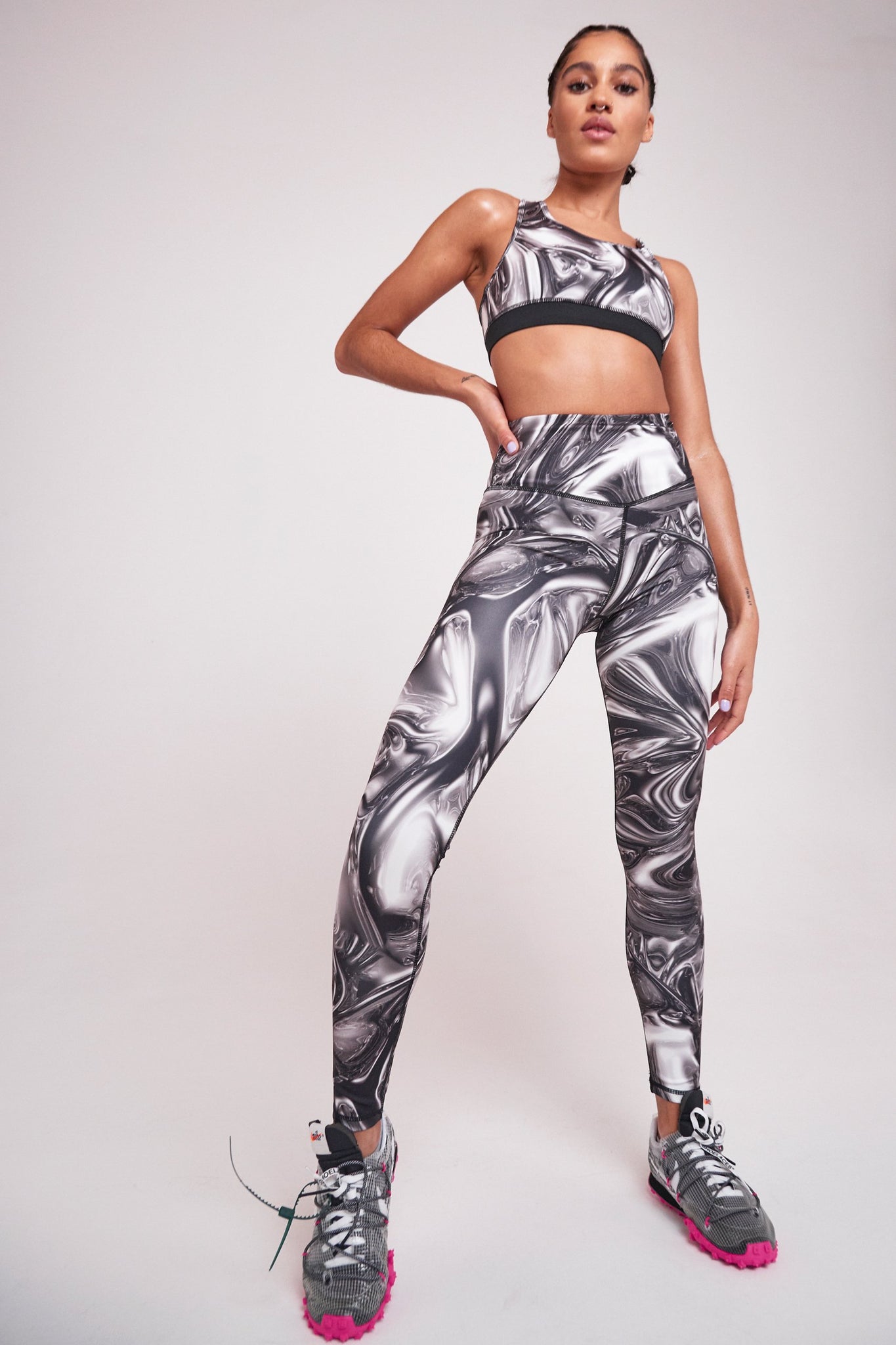 %text-1-start% Work out in style rocking our chrome print sports bra. Pair with the matching leggings for a badass gym co-ord!