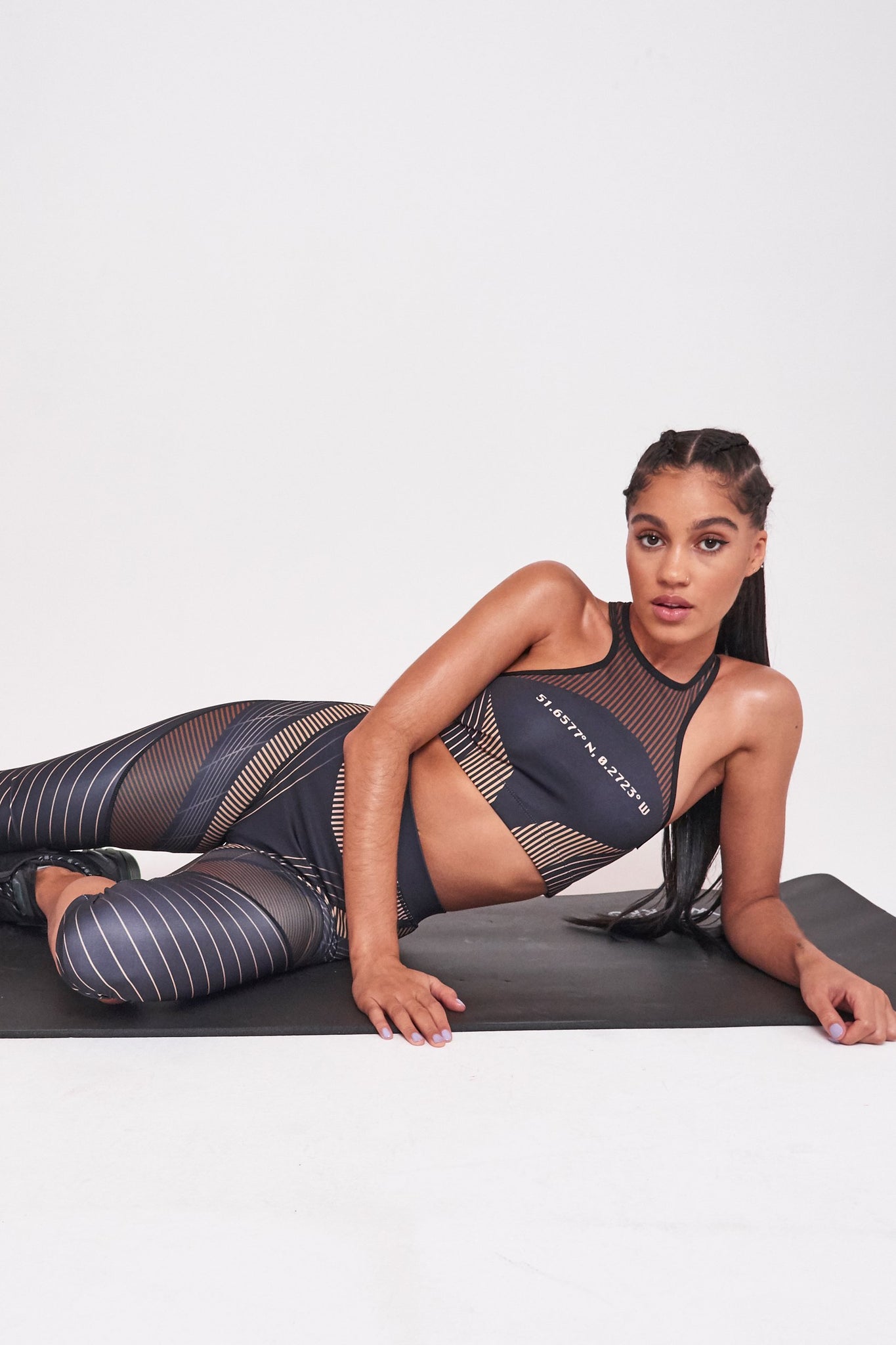%text-1-start% Work out in style rocking our compression print racer neck sports bra. Pair with the matching leggings for a badass gym co-ord!