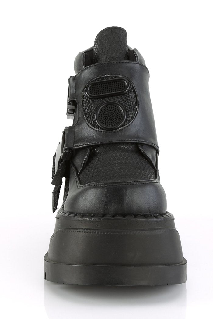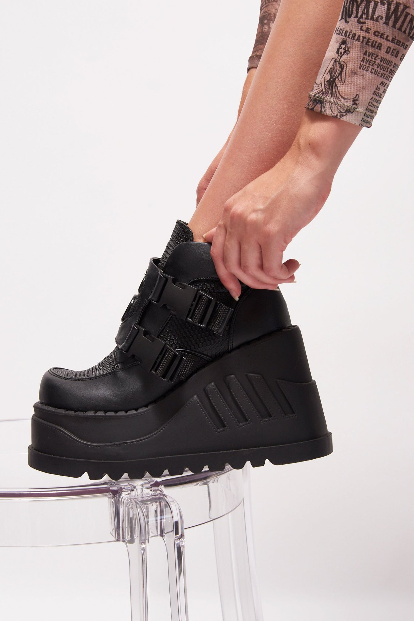 %text-1-start% Complete your outfit rocking Demonia's super sassy black wedge boots with buckle detailing!