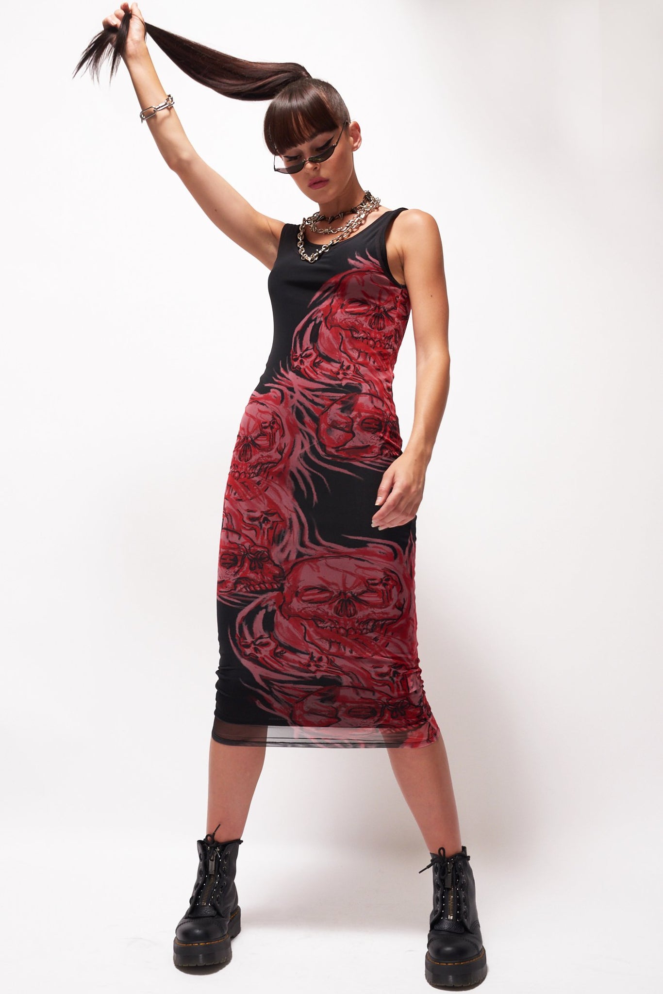 %text-1-start% Upgrade your wardrobe this season rocking our double layer rib & mesh skull print dress!