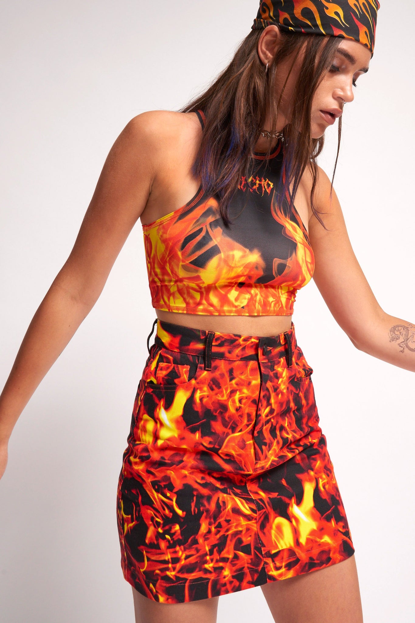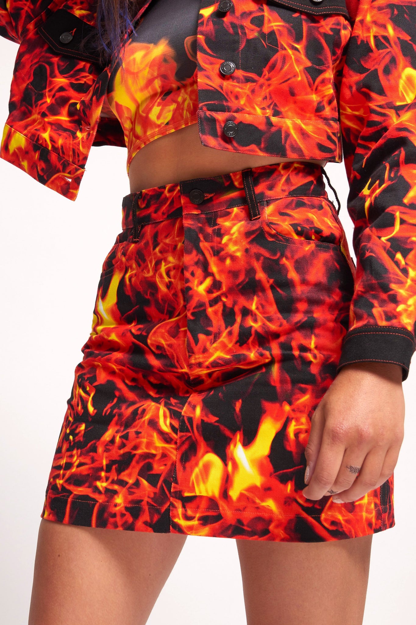 %text-1-start% Flames for days! Be sure to have heads turning when rocking our flame print denim skirt, pair with the matching jacket for a super hot co-ord!