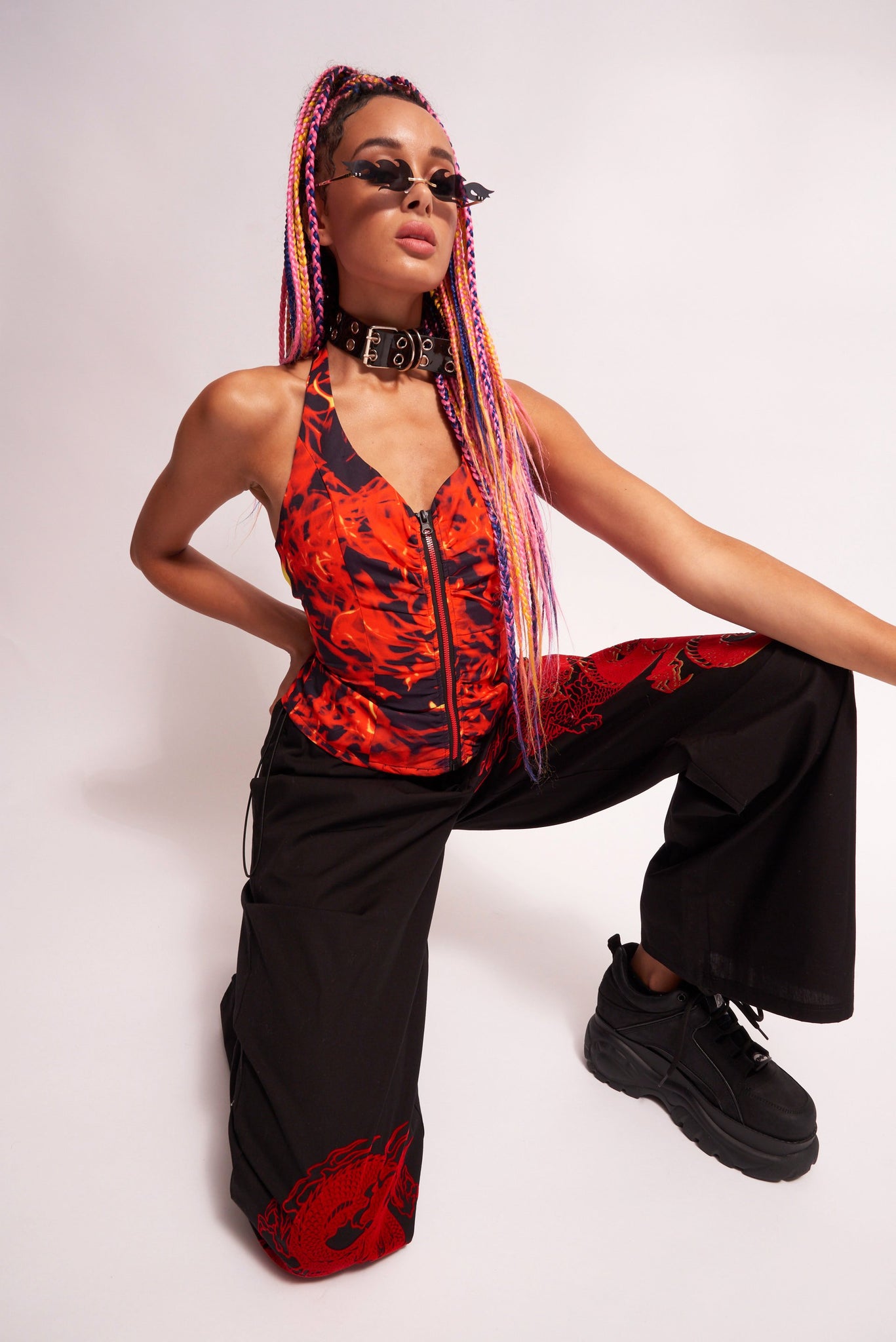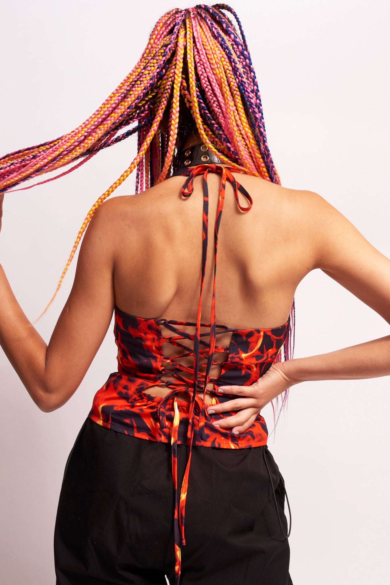 %text-1-start% Flames for days! Be sure to have heads turning when rocking our flame print halter neck corset top.