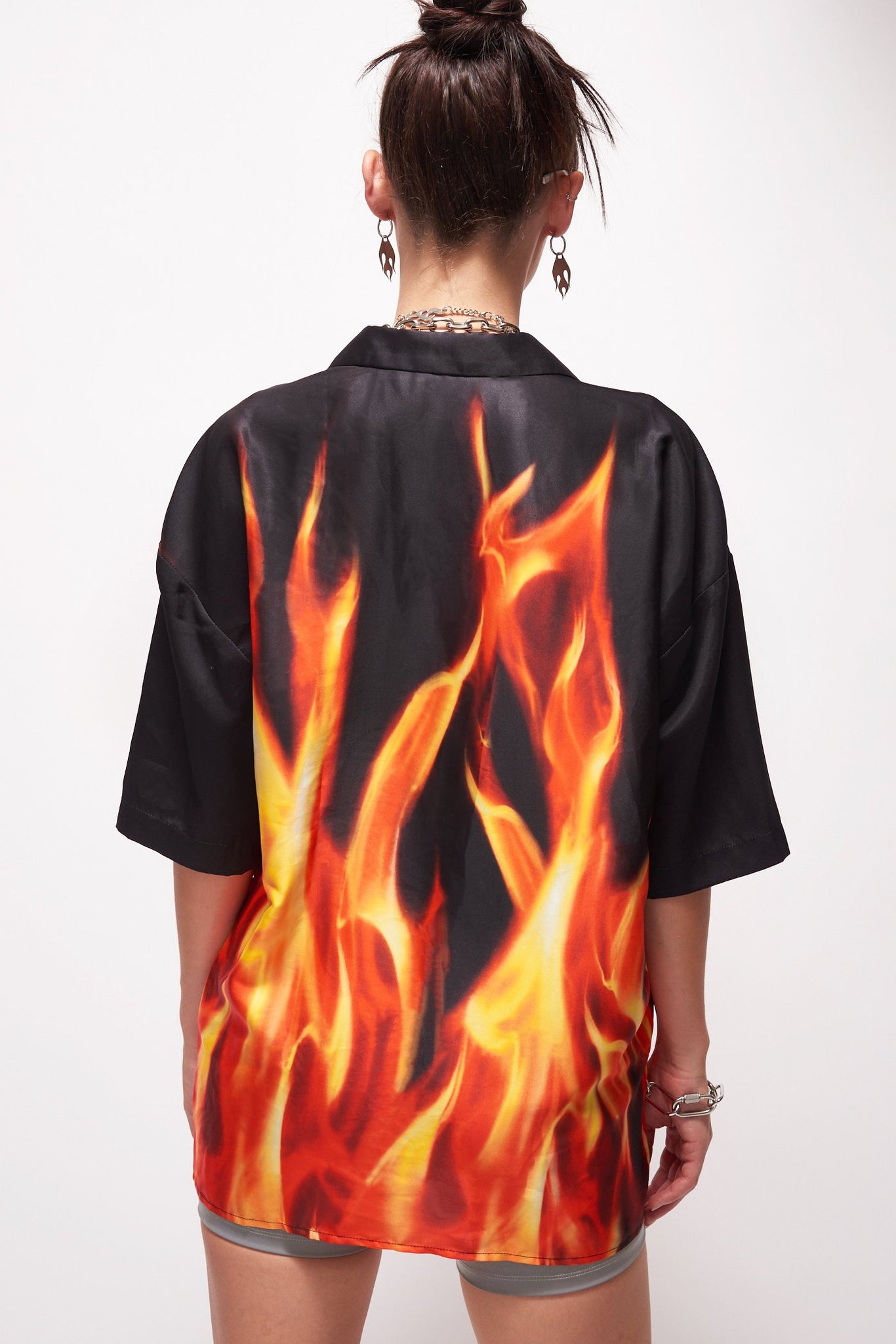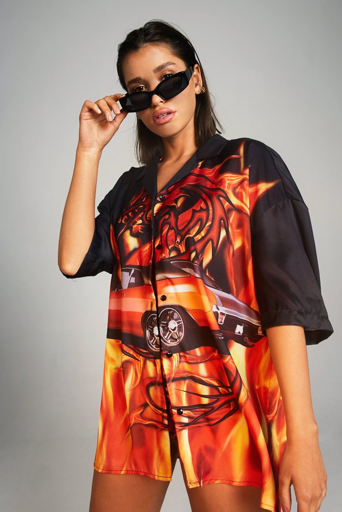 %text-1-start% Switch up your prints this season rocking our flaming car print oversized shirt!