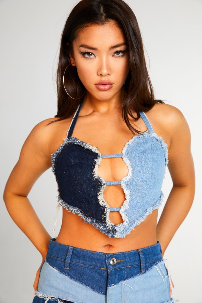 %text-1-start% Be a heartbreaker in the frayed patchwork heart halter top