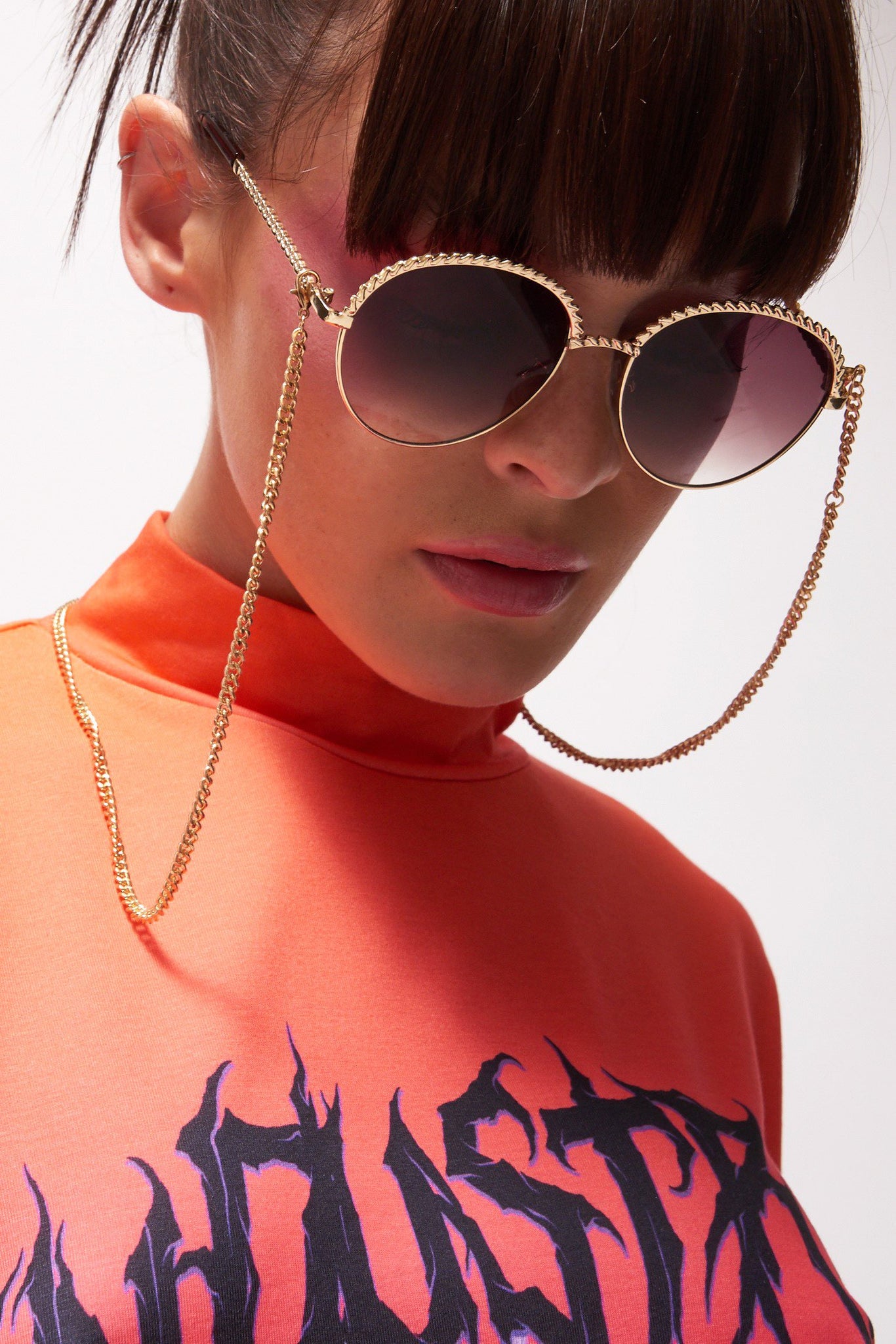 %text-1-start% Upgrade your accessory game rocking our gold circle sunglasses with chain detail!