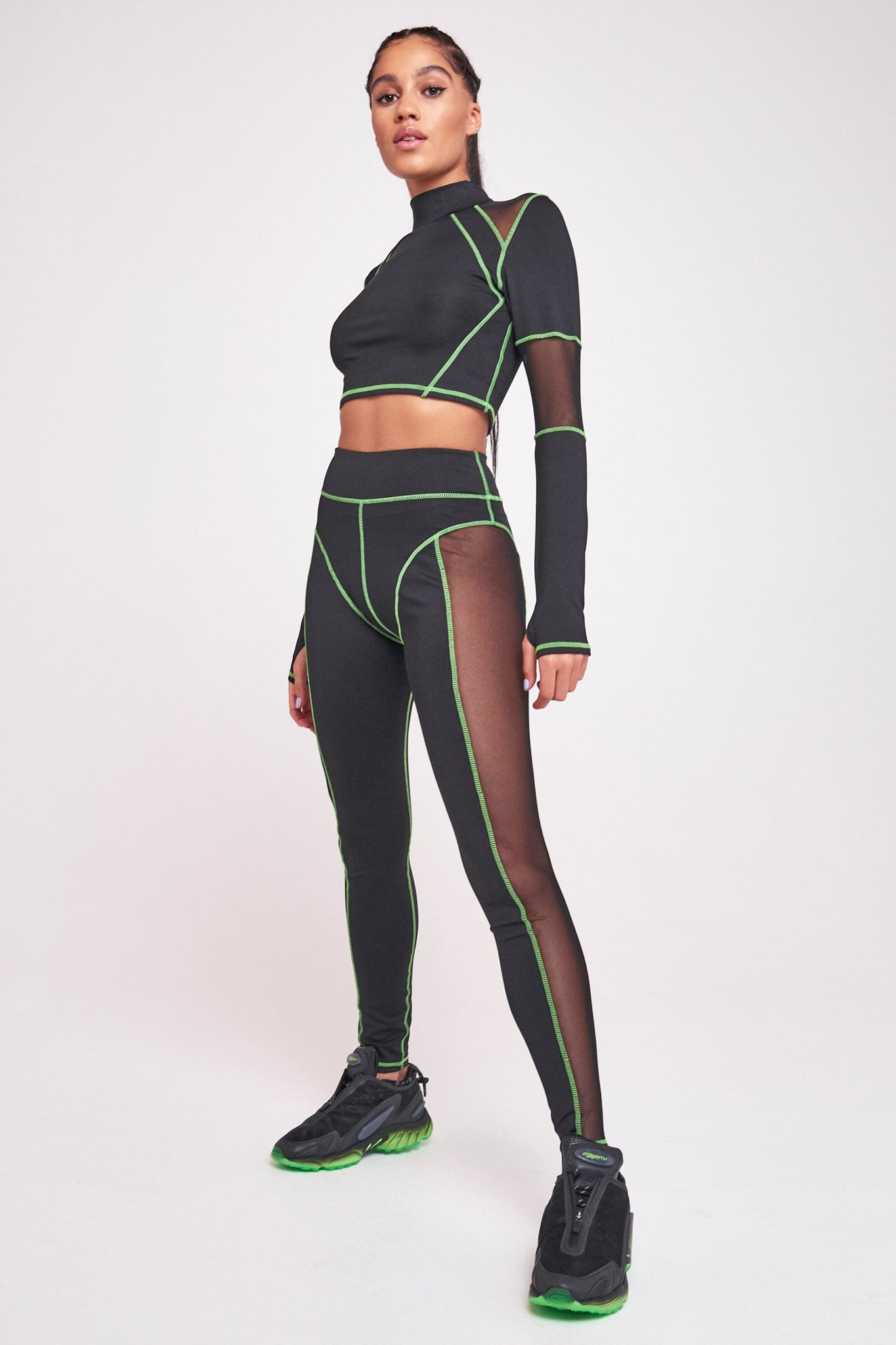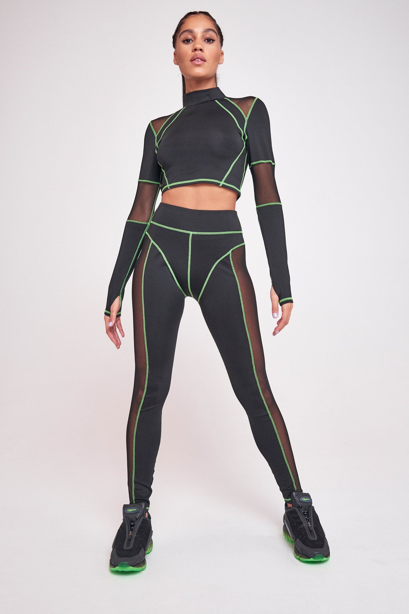 %text-1-start% Work out in style rocking our Green & Black High Neck Mesh Top. Pair with the matching leggings & sports bra for a badass gym co-ord!