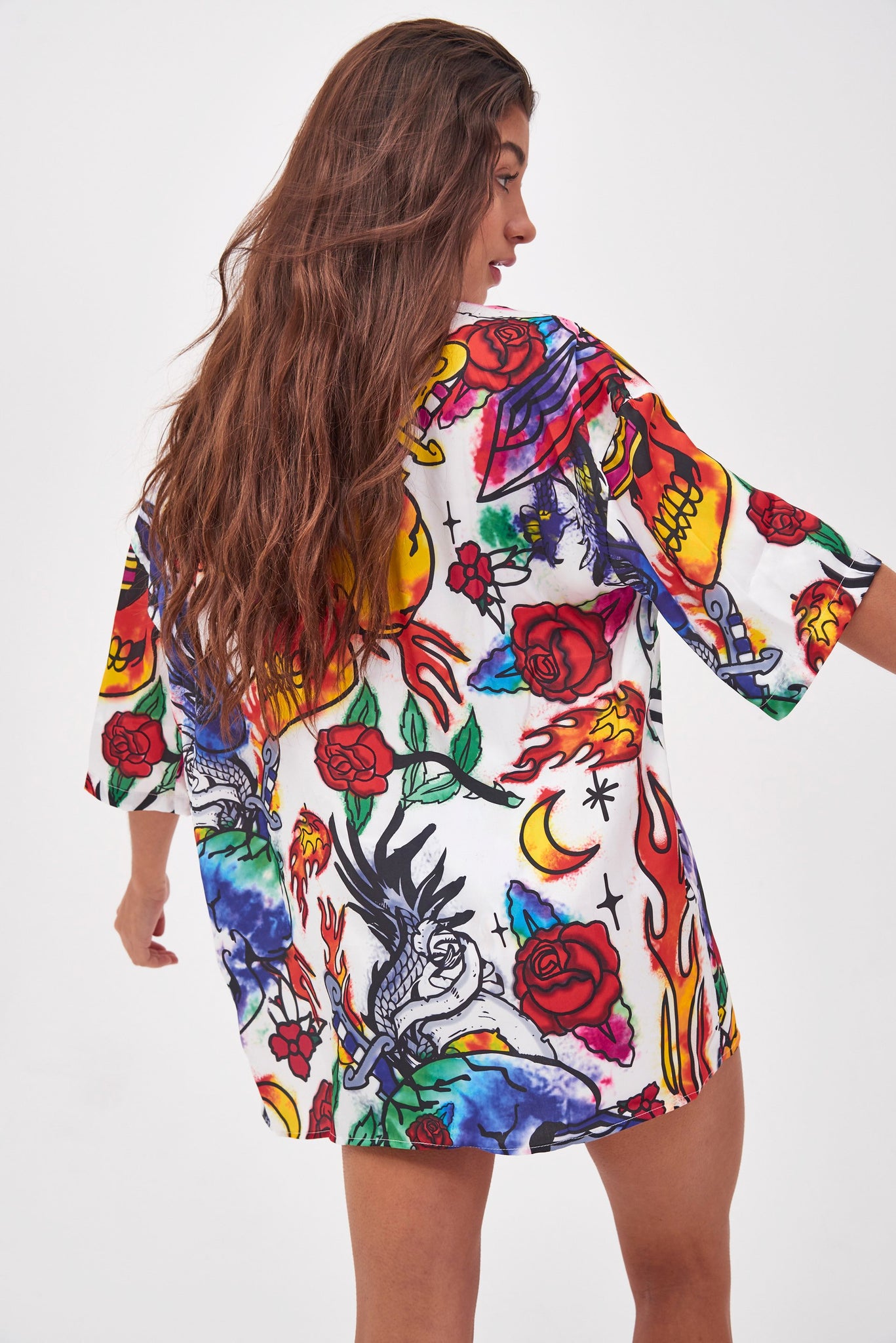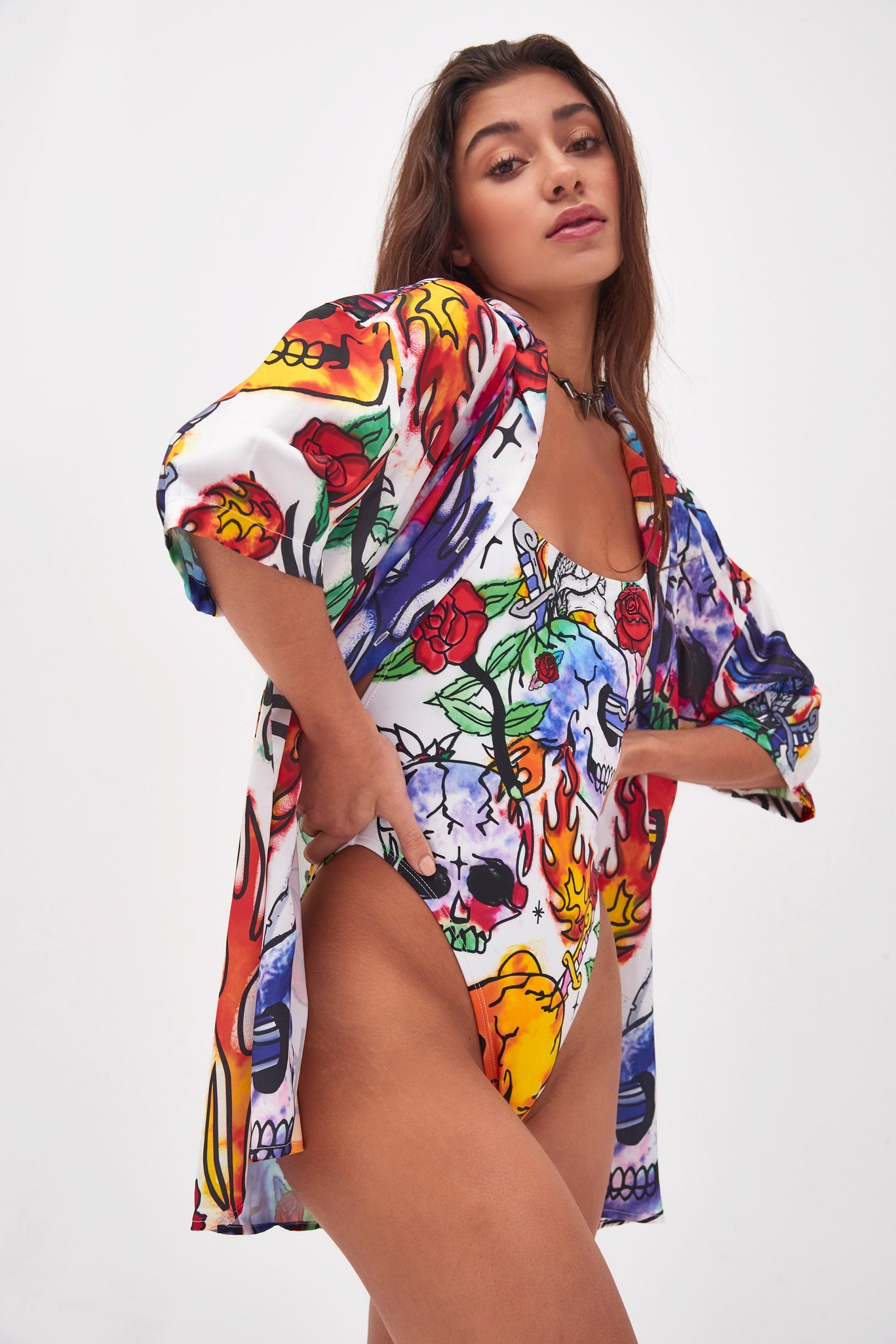 %text-1-start% Add some print to your swimwear wardrobe rocking our graffiti skull print beach shirt. Pair with the matching swimsuit for the ultimate beach co-ord!