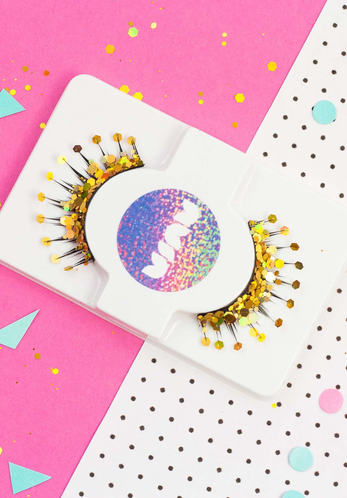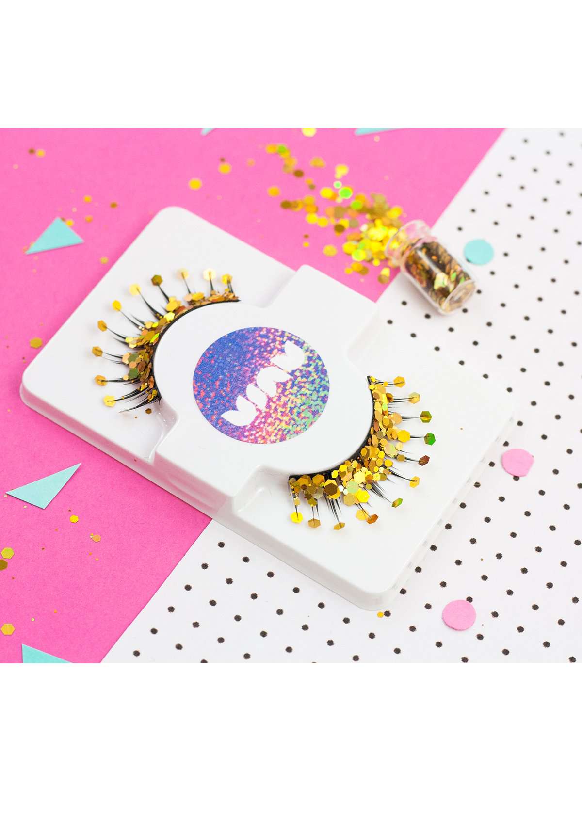 Give your lashes a golden flutter with these handmade gold holographic glitter false eyelashes. With a pot of matching glitter to top up your lashes or add extra dazzle around your eyes.